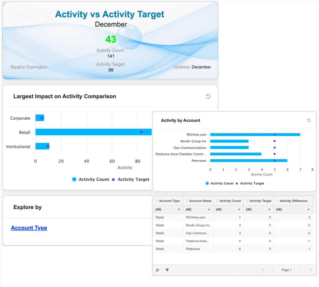 Salespeople often lack insights into how account activity in their territory compares to the activity target set by the sales organization. A high-level account activity metric fails to provide sufficient details to help drive the right selling behaviors. The Account Activity Comparison application compares actual account activity in a territory versus activity target, highlights which account types had the largest impact, and provides details about the difference in activities for specific account types.