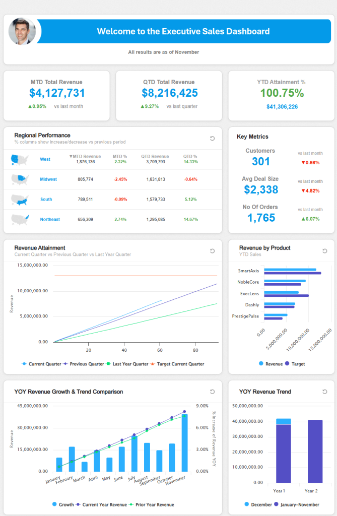 The Executive Regional Performance App provides executives with a real-time view of financial and operational performance by region. It enables comparison across time periods to identify trends and variances, track monthly revenue and growth, and assess operational drivers such as customer count, average deal size, and order volume. Leaders can also review top-performing states and product-level revenue to guide regional strategy and investment decisions.