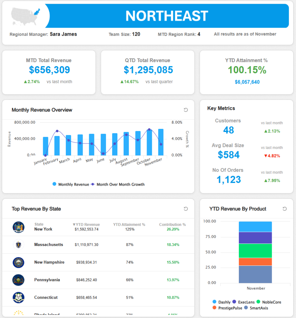 The Executive Revenue Overview App delivers a centralized view of organizational sales performance across regions or business units. Executives can review high-level sales results across key timeframes, benchmark performance against targets and prior periods, and drill into regional and key metrics to understand drivers of growth or underperformance. Trend analysis provides historical context to support strategic planning and executive oversight.