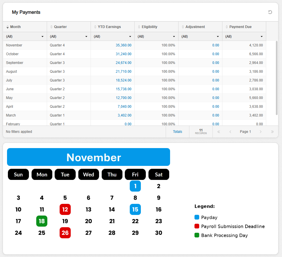 The Payments Schedule App provides a clear view of earned amounts, payable earnings, and payment timing. Monthly summaries explain what is being paid and why, while a calendar view highlights payroll and payment dates. This helps Sales Representatives plan ahead and stay informed about compensation timelines.