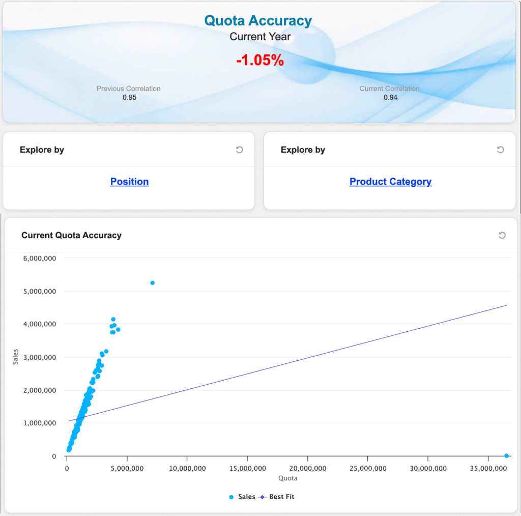 Sales analysts and leaders need to ensure that the quotas that are set are accurate. Without adequate tools to gauge quota performance, sales leaders are unable to determine if the set quotas are closely correlated with the sales performance. The Quota Accuracy application enables sales leaders and analysts to understand how the quotas correlate to the actual sales in the current period and how much that correlation has changed compared to the prior period. The application also highlights key accounts or products which contributed most to that change. Sales leaders and analysts can then explore the correlation for a specific position or product, and then view details about this change for each territory.