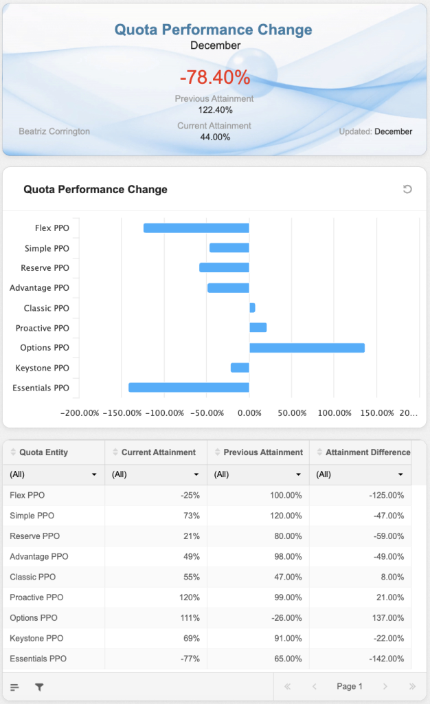 When the quota performance changes over time – whether up or down – it can be difficult for the salesperson to understand why that change happened. The Quota Performance Change (Period over Period) application enables a salesperson to understand the change in their current period quota attainment compared to the prior period. The application also identifies key product categories which contributed the most to that change. The salesperson can then explore the change by product categories to view granular details.