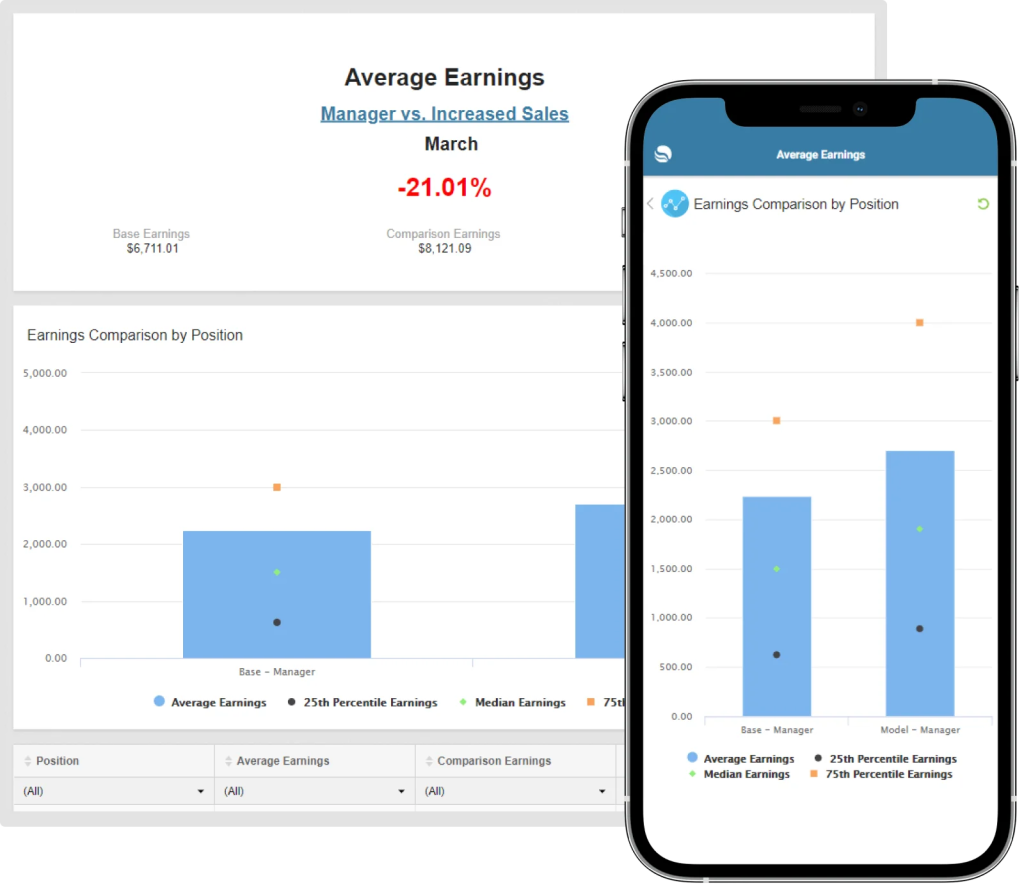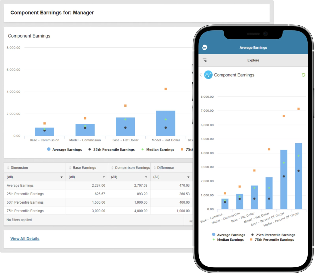The Scenario Comparison (Average Earnings) report provides analysts with the ability to compare average earnings from two different compensation plan scenarios for multiple sales positions, for a selected period. Analysts can further explore the comparison of average earnings by component for each position, and then view details of the average earnings for each employee in each position.