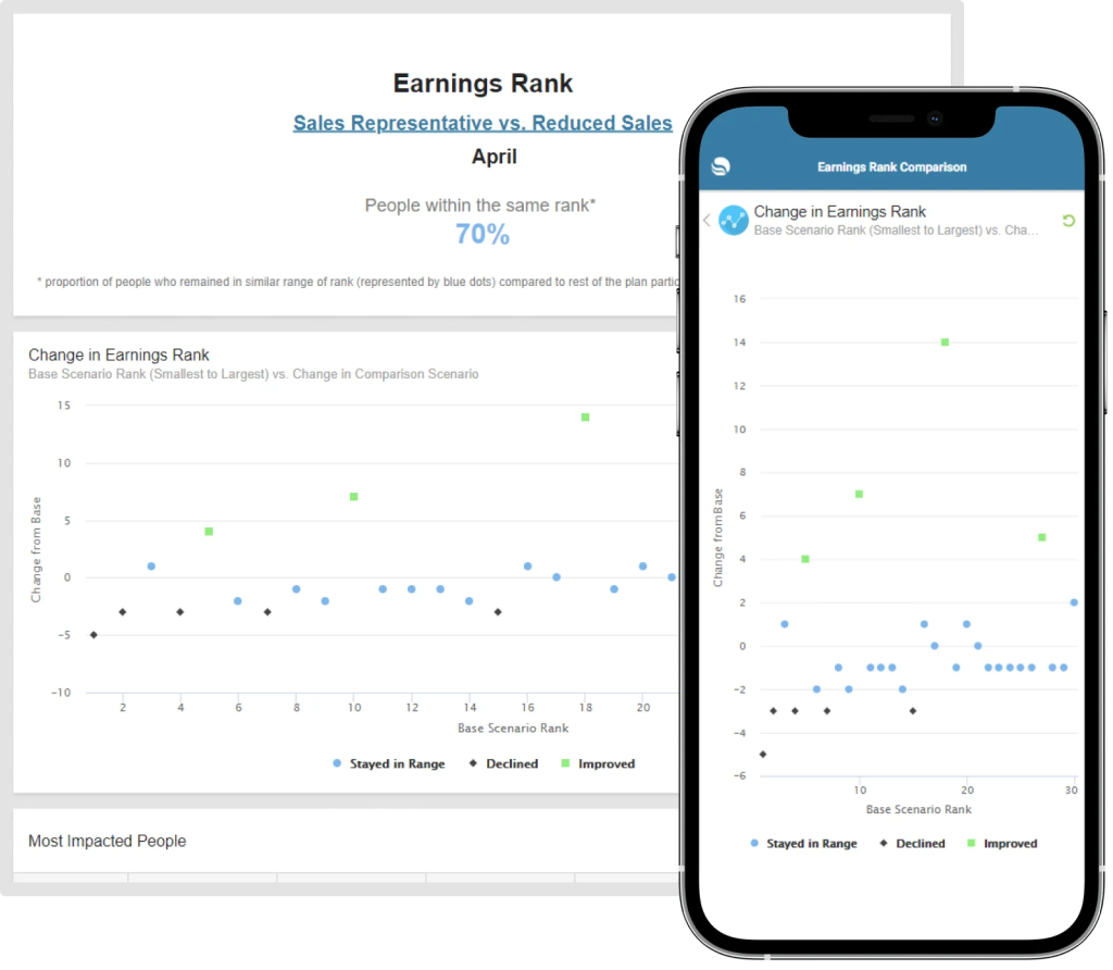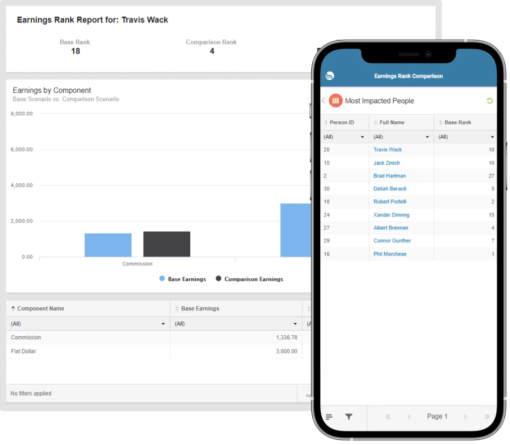 The Scenario Comparison (Earnings Rank) report provides analysts the ability to compare earnings ranks from two different compensation plan scenarios for multiple sales positions, for a selected period. Analysts can further explore the comparison of earnings rankings by position or component, and then view details of the ranking and earnings for each employee in each position.