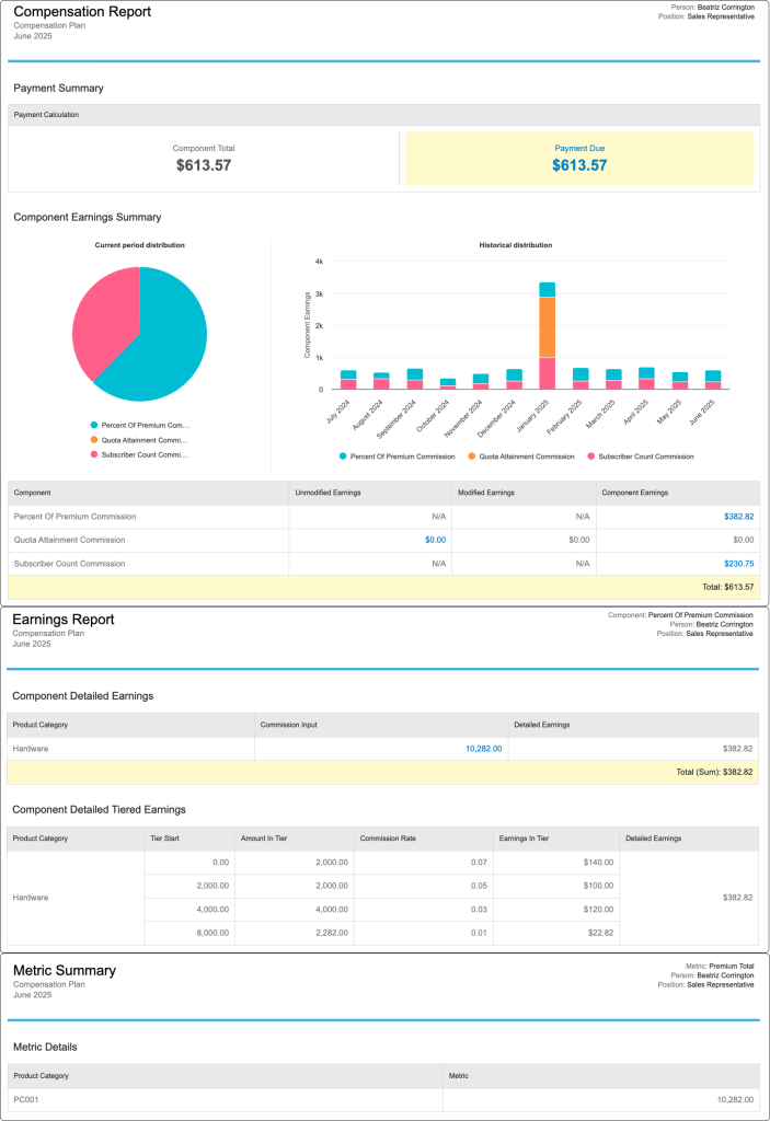 Sales compensation plans aim to encourage behaviors that align with an organization’s overall goals by incentivizing high performers. However, if the earnings calculation from a sales compensation plan is not easy to understand, it may demotivate salespeople from exhibiting desired behaviors set in a compensation plan. The Compensation Plan Report removes ambiguities surrounding compensation calculation by breaking down earnings to their most basic constituent factors and enables salespeople to understand the math behind their earnings while connecting the dots from sales transactions to payroll.