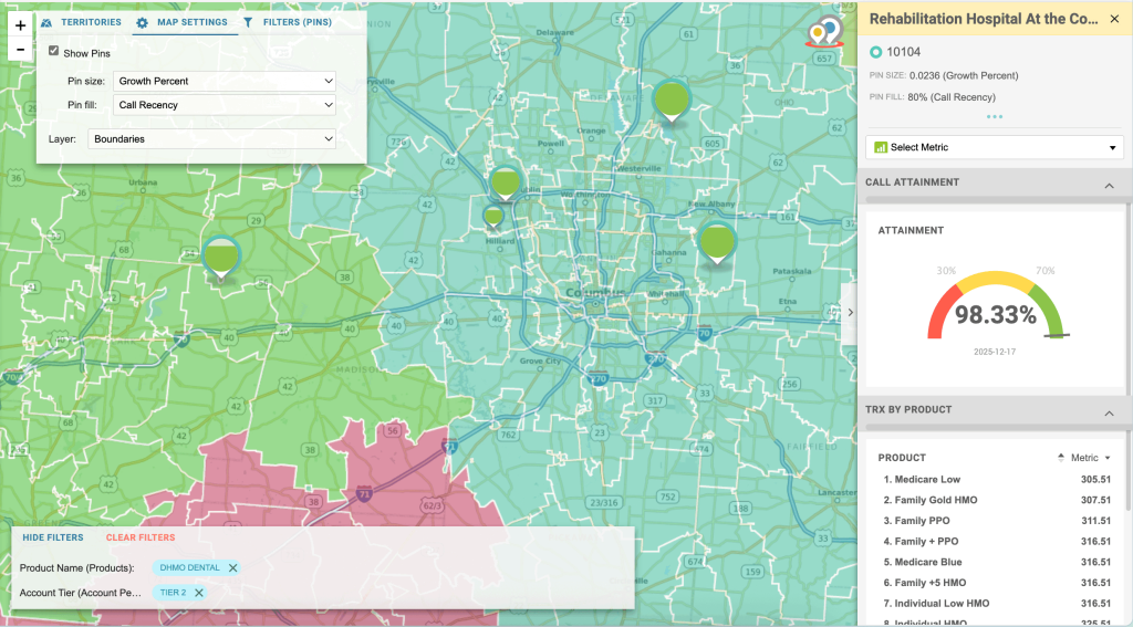 Sales territories align the strategic goals of a sales organization with a geographical area based on industry, account types, or other attributes. Salespeople work to meet those goals within their assigned territories. Understanding each territory’s health goes beyond the overall attainment and requires breaking down each territory’s performance into meaningful segments. Use Territory Analysis to provide a visual representation of salespeople’s performance in their territories by constituent territory entities and enable salespeople to make informed selling decisions.