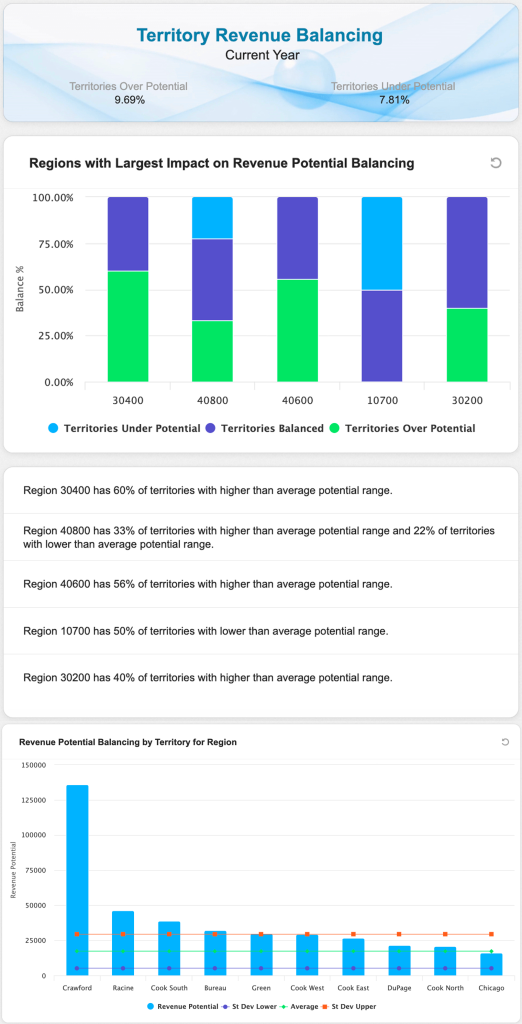 Sales leaders need to ensure that they are deploying their salesforce in the most effective way. The Territory Revenue Potential Balancing app enables sales leaders to quantify territory accounts balance by identifying regions with too high or too low revenue potential. The app also identifies the revenue potential balance by territory for a specific region.