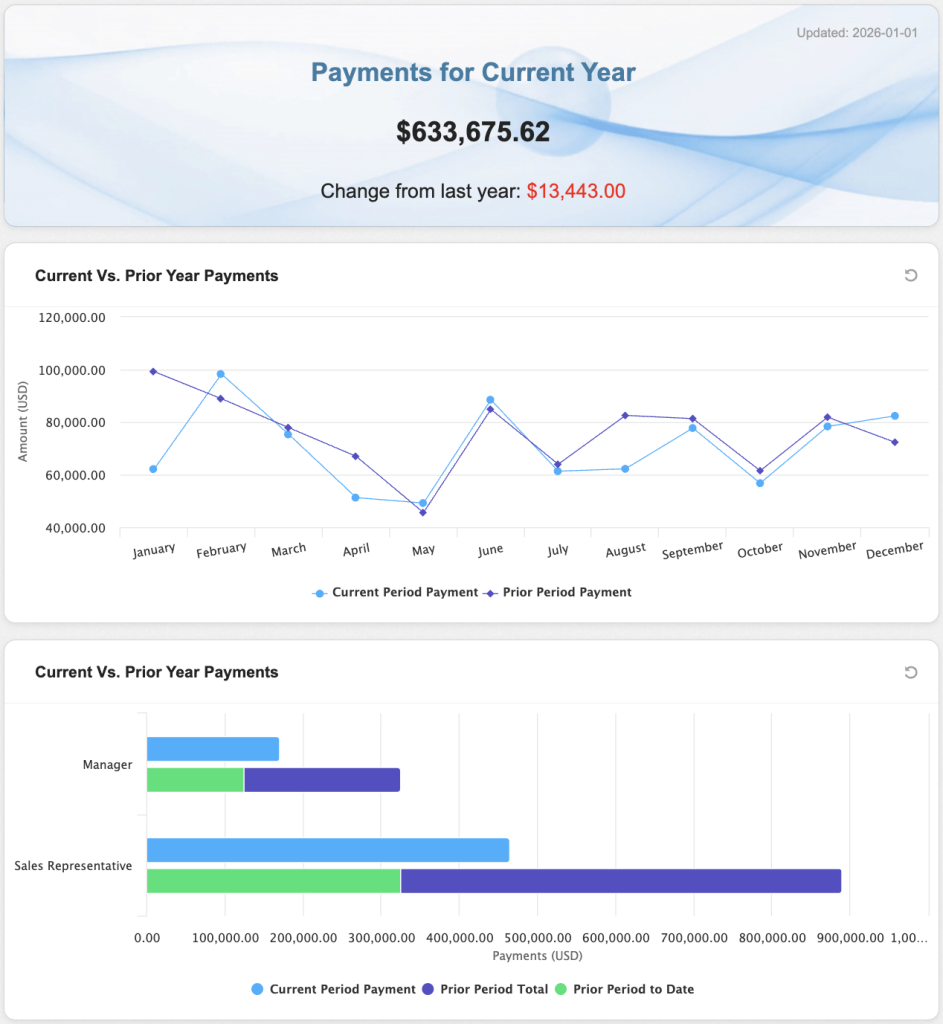 When the amount of payments changes over time, it can be difficult for sales leaders to identify positive or negative trends relative to the set budget. The YTD Payments application enables sales leaders to understand the progression of payments, period to period, with the context of the budget and historical payments for reference. The sales leader can then explore the change by product categories or accounts to view granular details related to those specific product categories or accounts.
